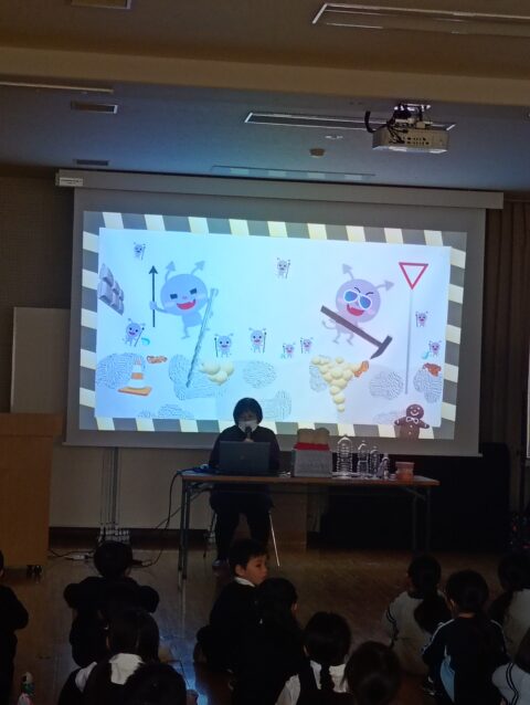 歯磨きの大切さを子どもたちにわかりやすく、実際の写真を混ぜながら、そして、子どもたちに考えさせながら伝えていただきました。