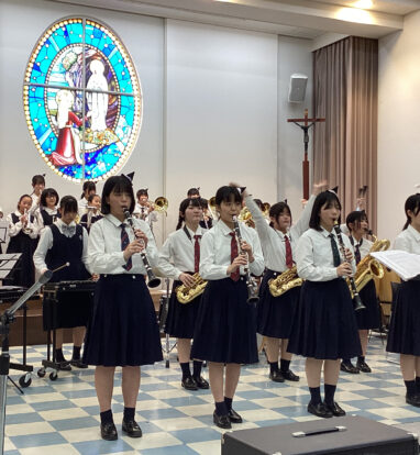 初めて入る中高の第一多目的室は、正面に素敵なステンドグラスのあるホールで、クリスマスを前に厳かな気持ちになる会場に子どもたちもワクワクドキドキ!