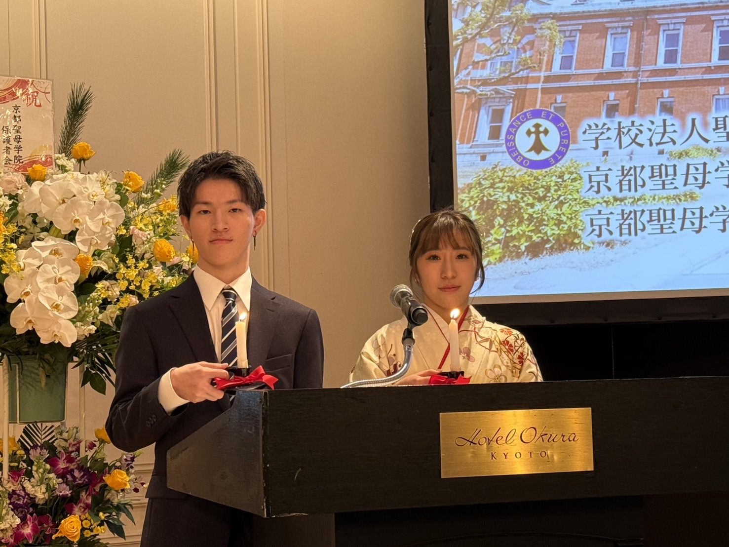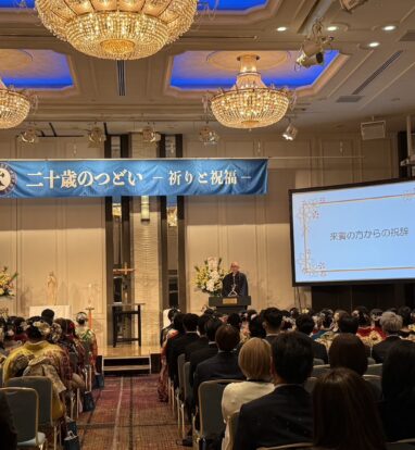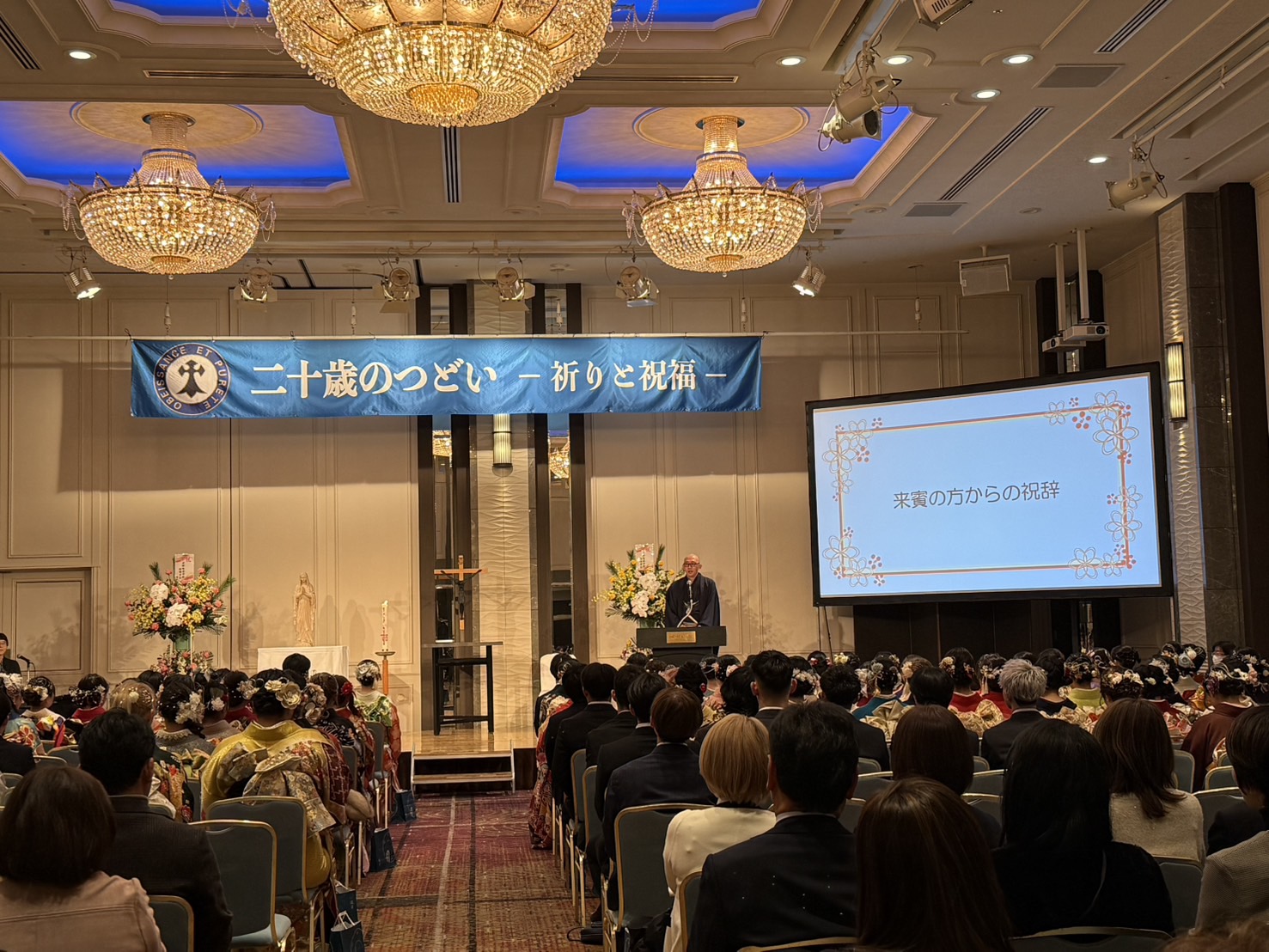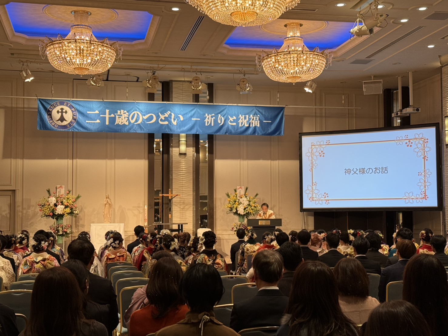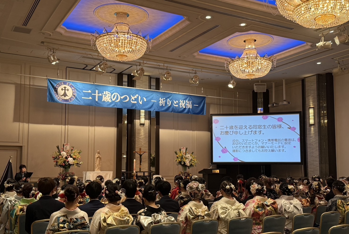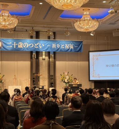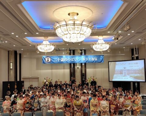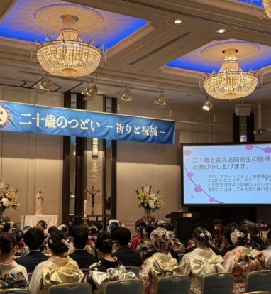 本日、ホテルオークラ京都にて卒業生の「二十歳のつどい」を行いました。京都聖母学院小学校や京都聖母学院中学高等学校の卒業生120名と、そのご家族がたくさんお越しくださり、菅原神父様の司式による祈りのつどいを行い、祝福をいただきました。