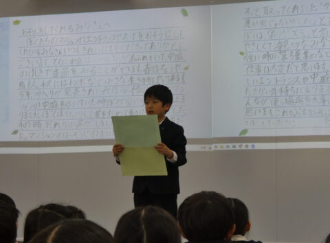 3年生の作品「おそうじをしてくれるみなさんへ」自宅マンションのエントランス掃除をしてくださっている方への感謝を伝えるお手紙です。肩に止まったカナブンを取ってもらった、心温まるエピソードも綴りました。