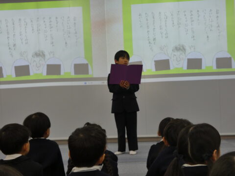 1年生の作品「おかあさんありがとう」ご飯を作ってくれるお母さんへの感謝のお手紙です。1番好きなのはお弁当のおにぎりで、お母さんの温かさを感じることを綴りました。