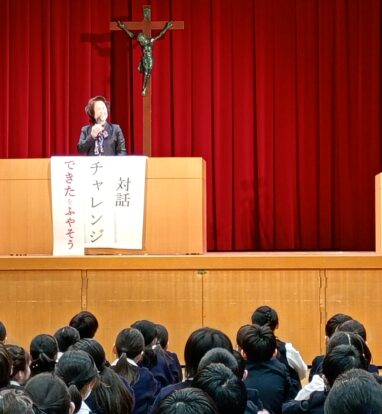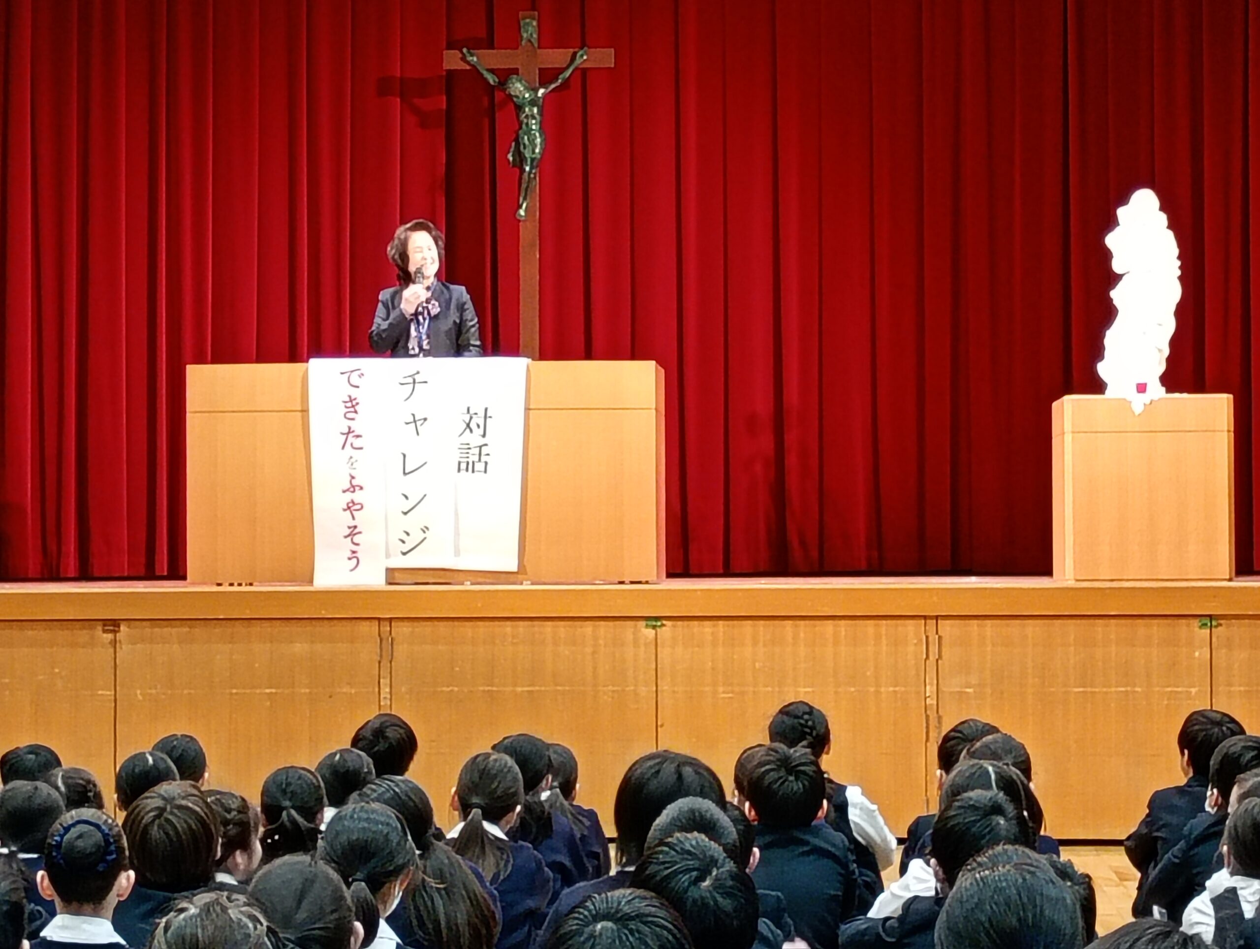 今年大切にしたいこととして、相手の気持ちや考えを心で受け止めながら深く話し合う『対話』と、今はできなくてもできるようになりたいことに挑戦し続ける『チャレンジ』、さらに学校は多くの人と助け合いながら成長する場所なので、周りの人と心を通わせ、『できたをふやそう』という3つに取り組んでいきましょう。