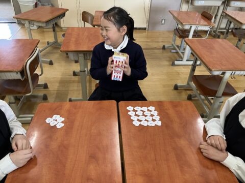 ポップコーンゲームとは、ポップコーンのカップに入ったポップコーンカードを引き、そこに書いてある英語が読めたらカードがゲットでき、一番多くゲットできた人が勝ちとなります。