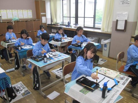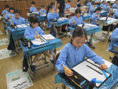 2026.04.25 │その他 3年生 はじめての習字 3年生の書写で習字をしました。 1・2年生は硬筆が中心でしたが、3年生からは習字を行います。習字道具の準備・片付けの仕方や筆の持ち方などを聞いて、いざ毛筆に挑戦。 今日はとにかく筆に慣れることをめあてにして、いろいろな線や形を太さを変えながら書いてみました。鉛筆との違いを感じながら一生懸命取り組んでいました。これから横角や縦画、はねやはらいなど学んでいきます。楽しみですね!