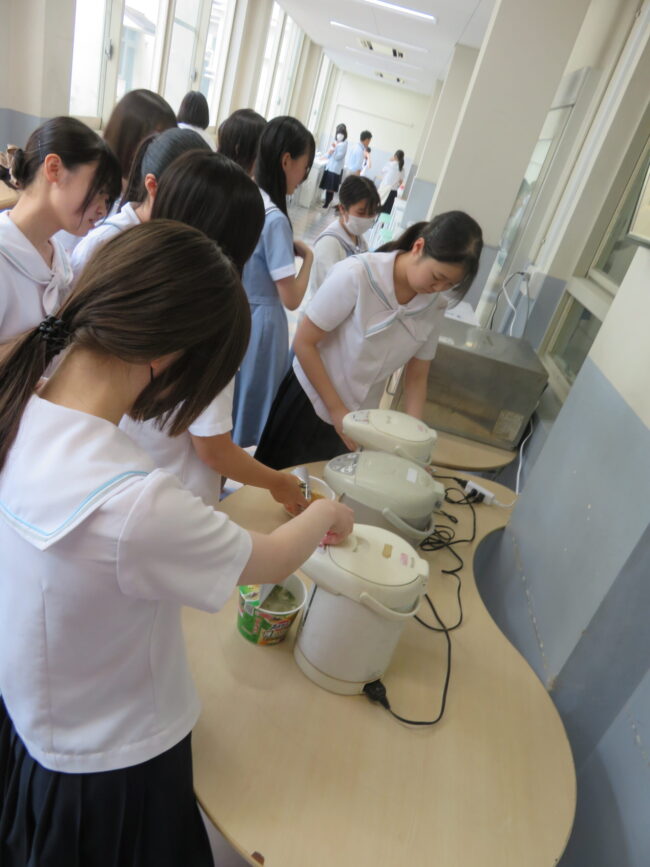 もともとあった軽食などを食べるエリアを、みんなで食事をとれるエリアにしました。ポットや電子レンジも常設され、温かい食事がいつでも取れるようになりました。夏場はもちろん、冬場には沢山の生徒が利用することでしょう。