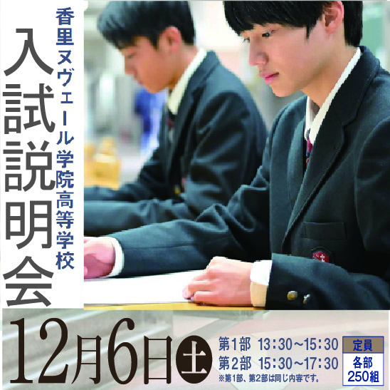 高校入試関連 香里ヌヴェール学院 > 高校入試関連 > 12/6(土)高校入試説明会2025.11.0712/6(土)高校入試説明会 入試についての説明会・受験相談をおこないます。保護者様のみ、受験生のみのご参加も可能です。第1部 13:30~15:30第2部 15:30~17:30 ※1部・2部は同じ内容です。各部定員250組。【内容】生徒による学校紹介・入試の傾向と対策・入試説明・受験相談(希望制)※受験相談を希望される方は、成績のわかる資料をお持ちください。 ※本校へご来校の際は、公共交通機関をご利用ください。自家用車・自転車の乗り入れはできません。 ‹ 申込開始!中学生対象オープンスクール