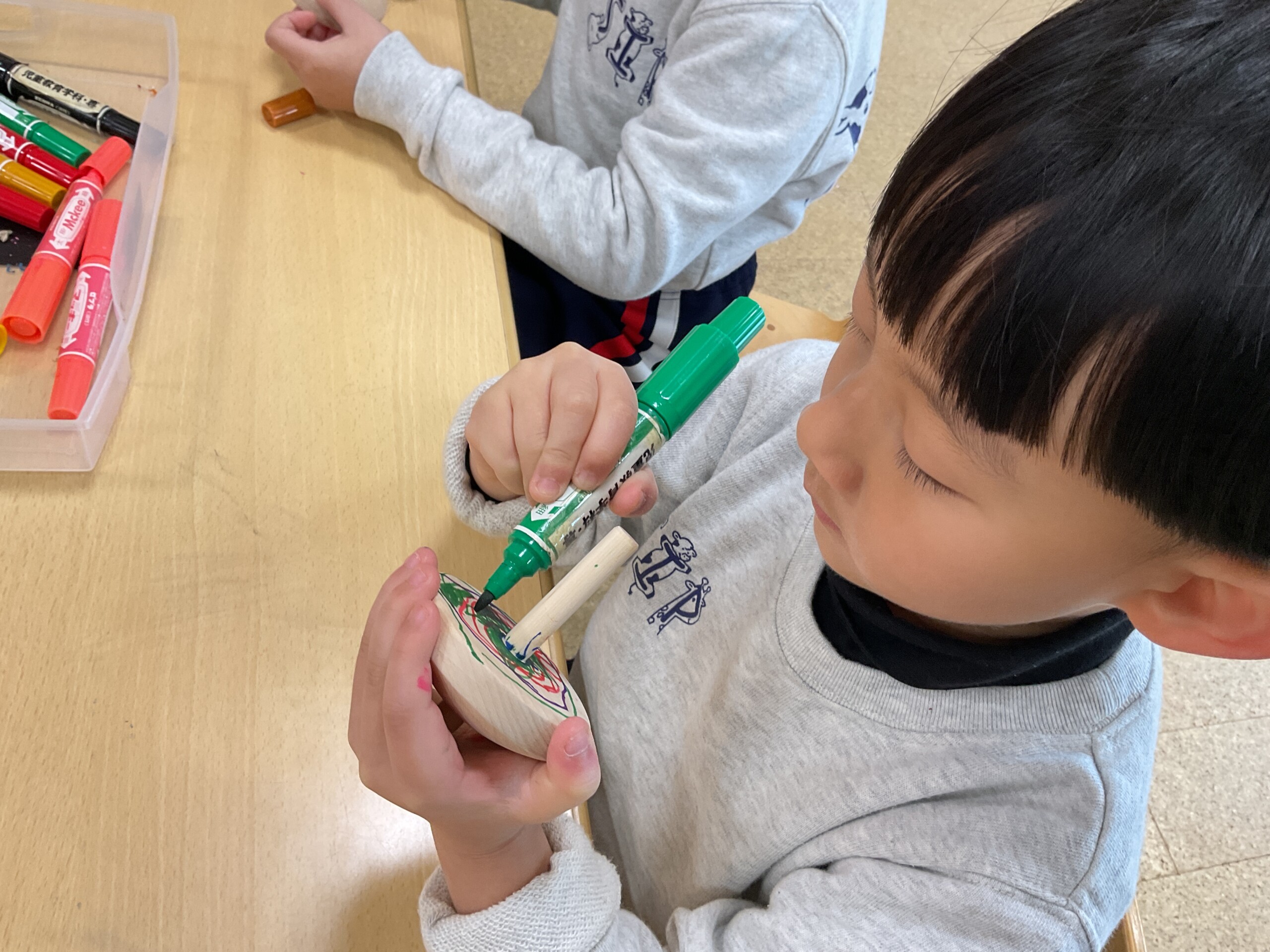 筆の柄の持つ場所を変えたり、握る力を変えたりすることで線の太さが変わることに驚く子どもたち。
