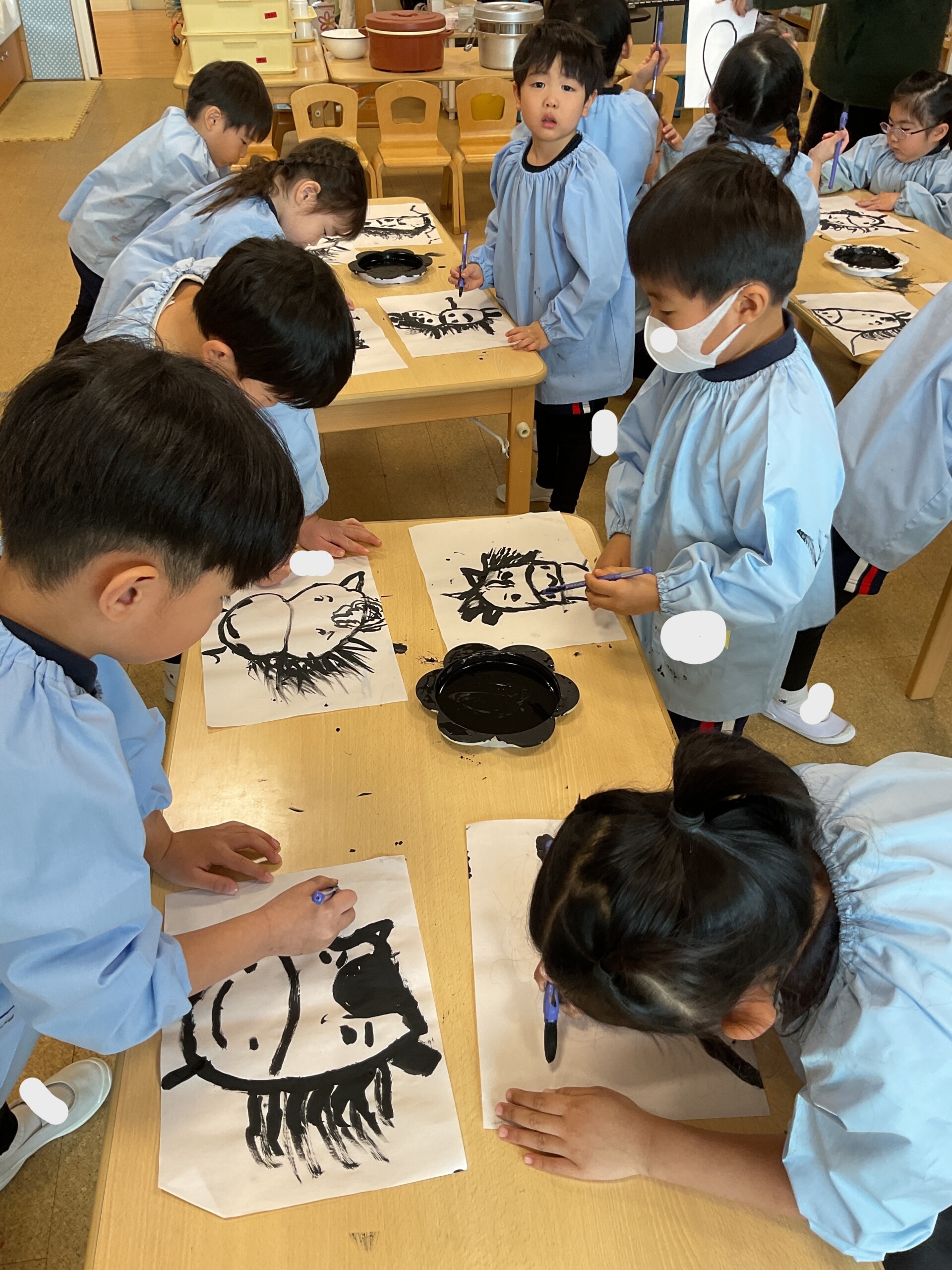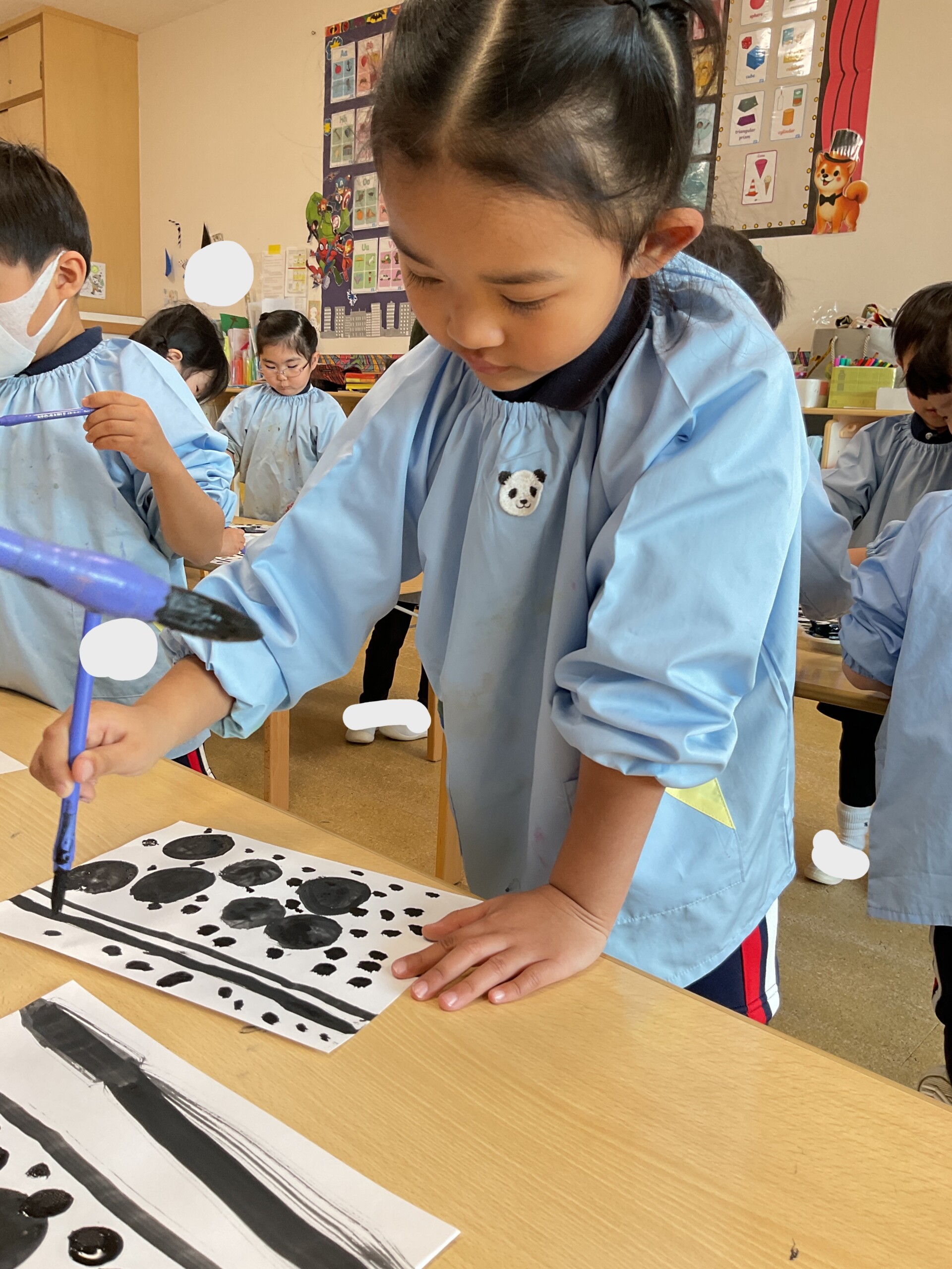 墨の代わりに絵の具を使い、まずは画用紙に線を描いたり、丸を描いたりしました。